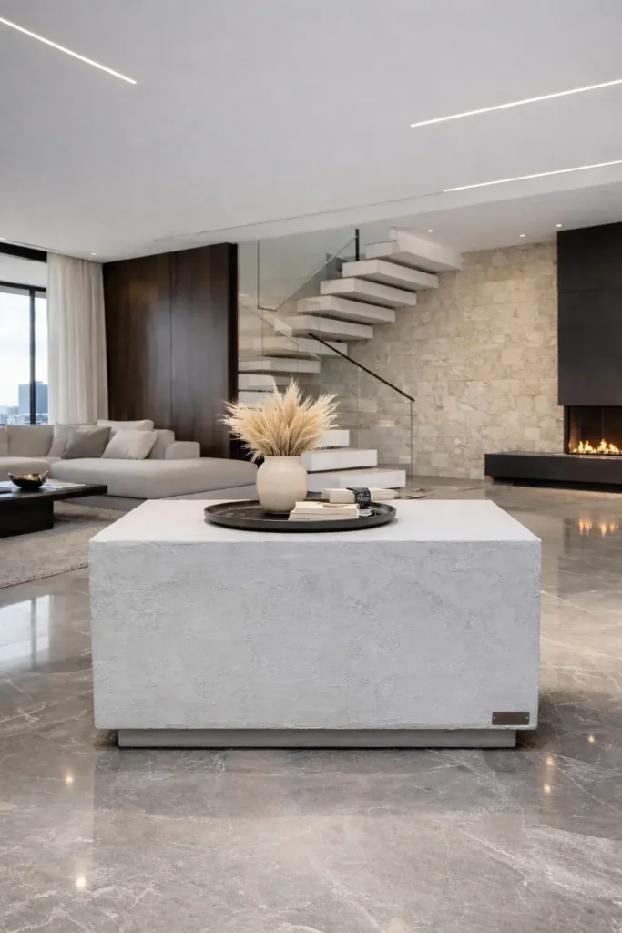 - Microcemento en paredes para un acabado moderno y uniforme.