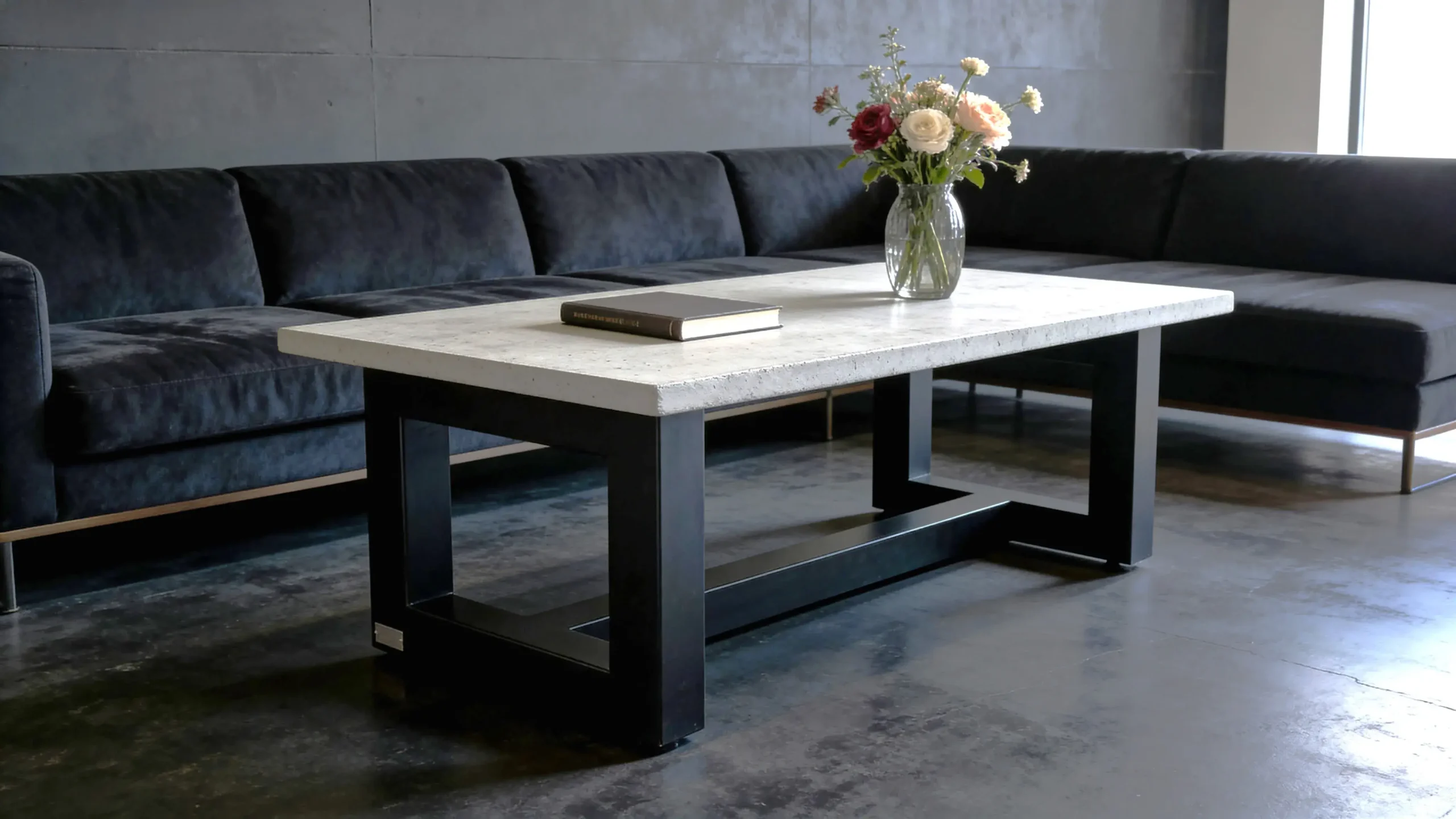 También diseñamos piezas únicas como mesas de microcemento a medida.